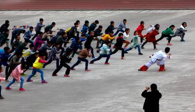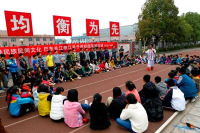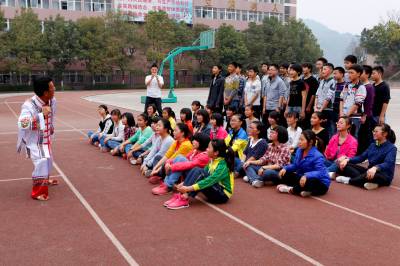 巴东县官渡口镇太矶头中学的体育课堂上民间艺术大师张厚彪在示范“峡江纤夫号子”的演唱基本要领。