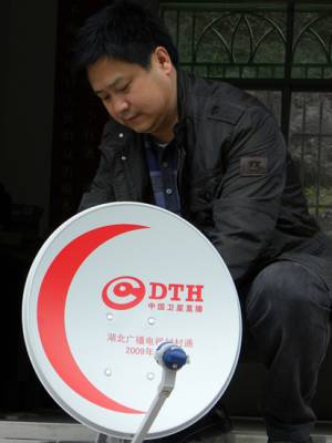 4月13日,秭归县泄滩乡文化体育广播服务中心主任郑邦恒正在为该乡万家村群众安装广播电视村村通天线锅。目前,该县正在全面开展此项工作。本报视界网王爱平摄
