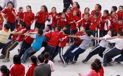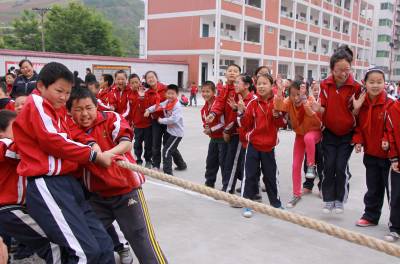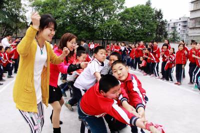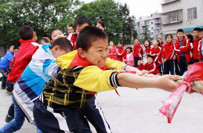 5月15日,竹山县宝丰镇施洋小学学生课间开展拔河比赛。春季开学以来,该县各学校广泛开展田径运动会、拔河、跳绳、踢毽子等丰富多彩的阳光体育活动项目,以有效引导广大学生走向操场、走进大自然、走到阳光下,积极参加体育锻炼,预防疾病,磨练意志,全力打造“阳光体育校园”。