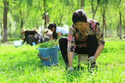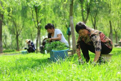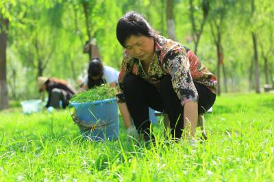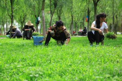 乱石滩变景观林 5月19日,工人在竹山县城关镇堵河青年林里除杂草、整理草坪。今年,该县在堵河两岸建成生态游园区7个,新增绿化面积160万平方米,种植树苗150余万株,从潘口电站坝址到城关镇南门村形成了17公里长的绿色景观林。昔日的乱石滩,如今变成了居民休闲游玩的景观带。(本报视界网 章磊 摄)