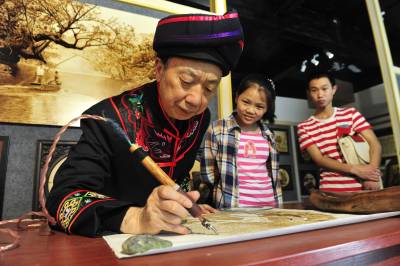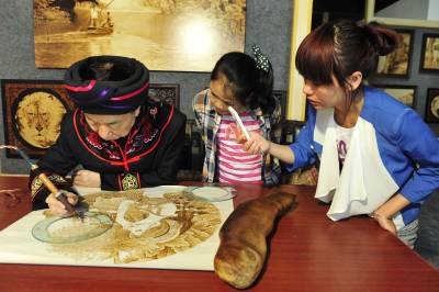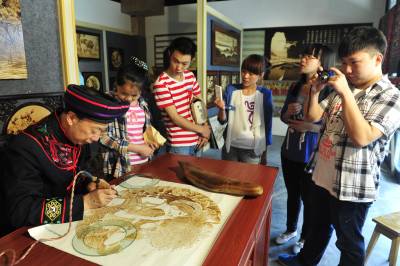 5月19日,恩施土家民间大师赵平国在创作丝绢烙画,吸引了爱好者驻足观看。