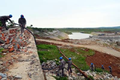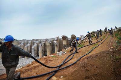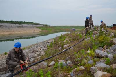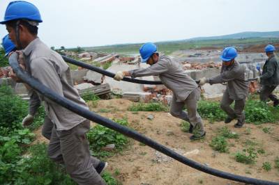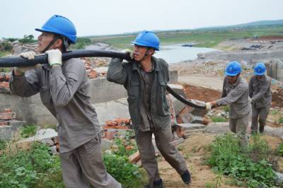 5月16日至18日,老河口市供电公司施工人员加班加点,顺利完成清泉沟抽水泵站配电安装工程,共安装箱式变压器6台、六单元户外环网柜1台、敷设高压带铠电缆1800米。清泉沟泵站承担老河口市、襄阳市襄州区、樊城区以及襄北农场210余万亩农田灌溉任务,因低于丹江口水库正常水位,无法自流灌溉,需要架设电力线路,为清泉沟提水抗旱提供电源保障。图为5月18日,施工人员在清泉沟泵站冒雨施工。
