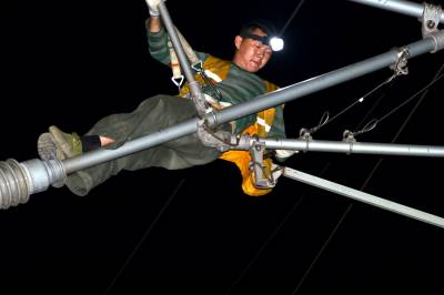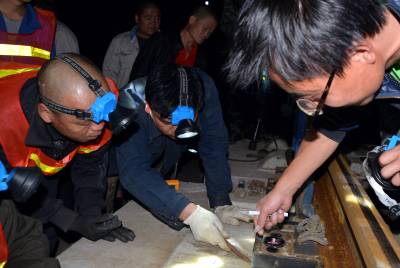 武(汉)-黄(石)城际铁路调试进入关键期,武汉铁路局桥工段鄂州工区的技术员们,利用晚上的时间,对接触网、钢轨、通讯及信号设施,根据调试列车员调试的数据,进行调整修正,以达到设计要求。