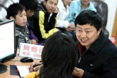 京山县新市二中英语老师陈安忠自2003年开办”网瘾诊所”以来,已义务帮助全市300多名学生成功戒除网瘾。2006年荣获荆门市”十大杰出志愿者”称号,2007年荣获荆门市”十大爱心大使”称号,2008年荣获京山县”十大师德标兵”称号。陈安忠奉献并快乐着,他希望有遇到孩子上网成瘾的家庭及时来到他的网瘾诊所,拨打手机13886903066,他乐于提供力所能及的帮助。(张文胜 摄)