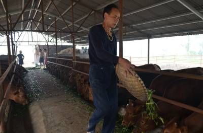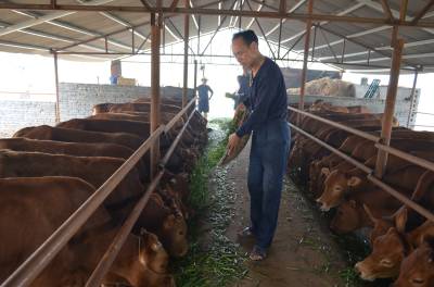 昔日砖厂老板 今日养牛大王 20日,安陆市棠棣镇胡巷村肉牛养殖场老板陈海官为肉牛添饲料。10年前,来自福建长乐市的陈海官到安陆办起砖瓦厂。2012年,砖厂关闭后,去年他又投资300万元建起一座占地20亩的肉牛养殖场。目前养殖肉牛130头,计划2年发展养牛1000头。 作者通联:安陆市委宣传部 电话:13886355004