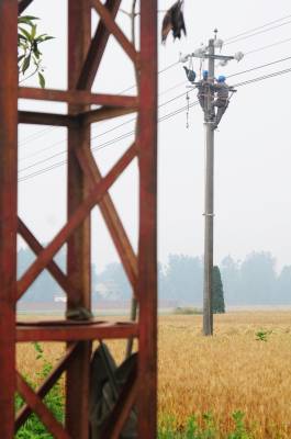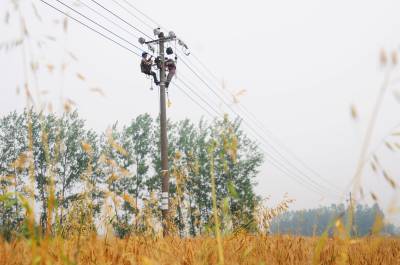 “三夏”来临之际,老河口市供电公司积极组织人员深入田间地头,对跨越田间的线路和设备进行巡视检查,确保农民在“三夏”期间安全可靠用电。图为5月21日,该公司施工人员在10千伏明家山支线紧固导线弧垂,提高导线的对地安全距离,为麦收期间收割机出入田间做好保障。