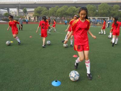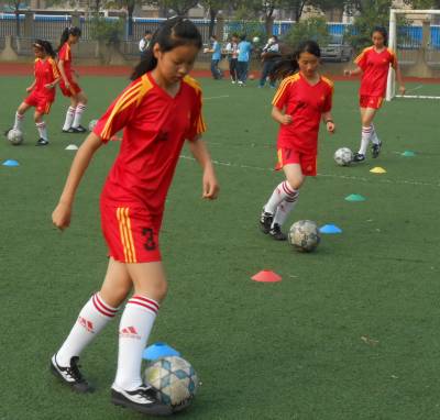 江汉区中学生女子足球队,在师生们盼望己久的呼声中终于现身,结束了多年来该区无中学女子足球队的历史。5月19日下午,身着"江汉"两字红足衫的武汉市七十一中学女子足球队10名队员,在学校体育老师和教练的指导下,正在进行带球穿行训练。这10名女队员,都是该校初一的学生,是从数百名女生中精挑细选的,绝大多数是进城农民工的宝贝女孩,她们在训练中特别吃苦肯学肯踏球,弥补了城市长大的女学生的体质不足。