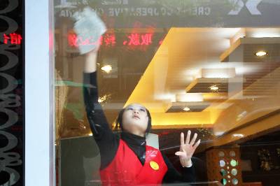 14日上午雨雪交加,荆门市遭遇倒春寒天气,最低气温接近0℃,市民们又重新穿上冬装。图为中天街一家餐馆的服务员正擦除玻璃墙上因温差大而凝结的水珠。视界网签约摄影师朱运兵摄