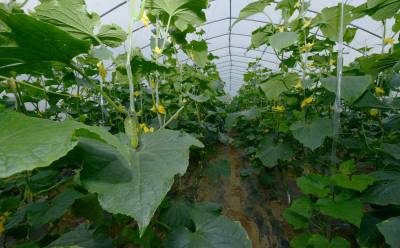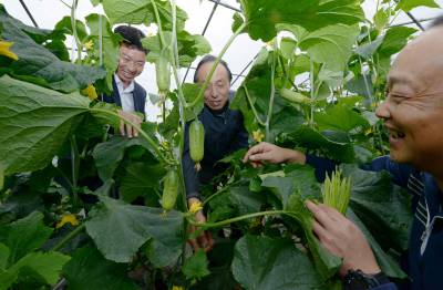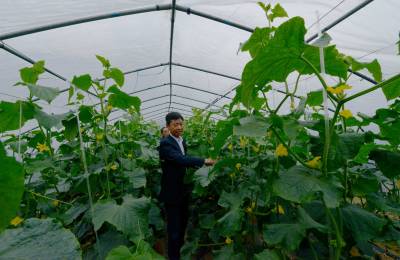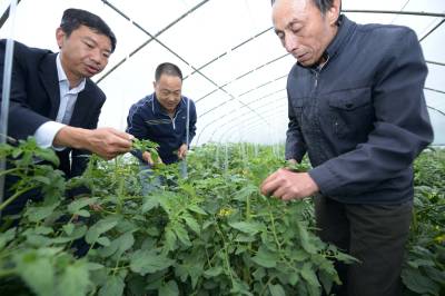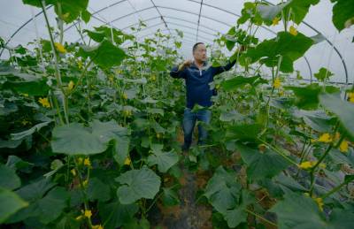 5月21日,蔬菜技术员在湖北省保康县寺坪镇庹家坪村绿满园专业合作社蔬菜大棚内查看黄瓜长势。