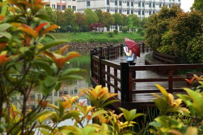 2010年4月14日,湖北经济学院亲水平台,该校一位同学在学习。当日一场春雨过后,绿树、浅草和一汪湖水,让校园的春天格外争艳。