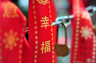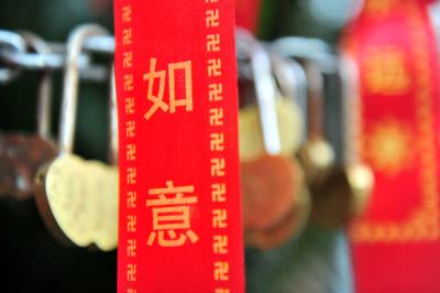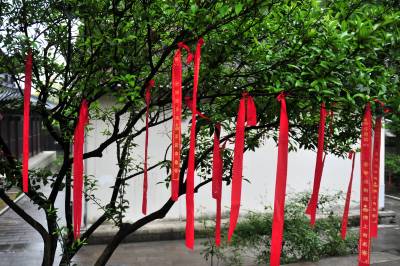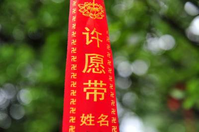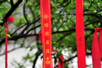 2014年5月23日,宜昌市夷陵区一景区内写满“幸福吉祥”、“婚姻美满”等祝福话语的鲜红许愿带,成为一道亮丽的风景线。时下不少游客都有了环保旅游的新概念,不再落下“到此一游”的不文明痕迹,而是以文明旅游的方式,选择一条许愿带,写上自己的名字,以求幸福平安。本报视界网 张国荣 摄