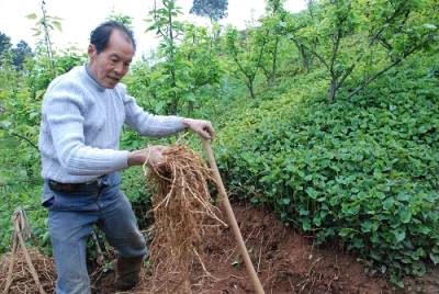 小佳肴大产业4月14日,业州镇柏腊树村12组村民何恒佑正在挖起栽种在梨树林里的鱼腥草。鱼腥草又名侧耳根,产于我国长江流域以南各省。凉拌侧耳根是民间的一道传统佳肴。柏腊树村地处城郊,村民在大力发展林果业的同时,利用林间空地人工栽种鱼腥草,现已发展到十多户人家,每天按时按量送到超市,每斤价格3元左右,每亩可收入一万多元,既为老百姓送上了一道美食,又为村民增加了收入。