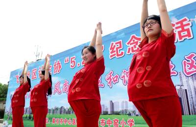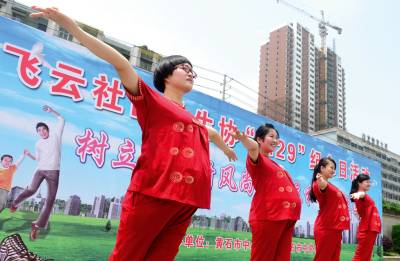 黄石市四名孕妇在西塞山区飞云社区计生协开展的“5.29”纪念日活动中展示瑜伽。