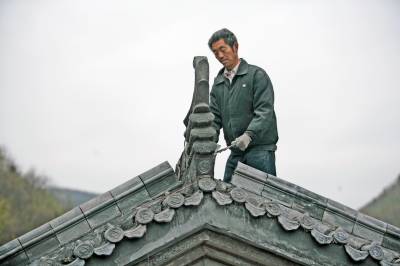 4月13,一名工人在建始县黄鹤桥石林区游客接待中心施工。目前,该县已在野三河休闲度假旅游区,完成了景阳旅游码头、黄鹤桥石林景区、小西湖游客接待中心等主体工程项目的建设,投入近亿元,精心打造国家3A级休闲度假景区。