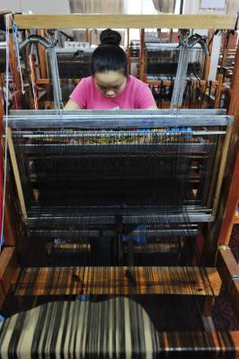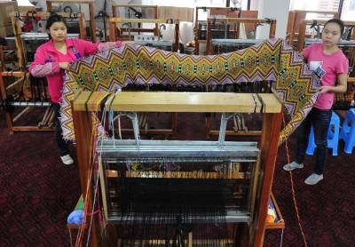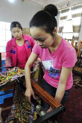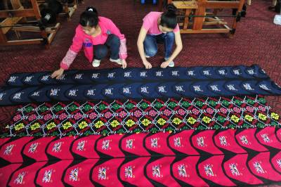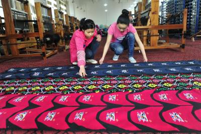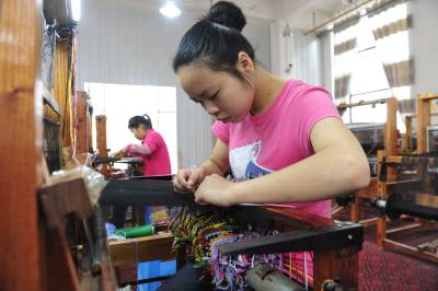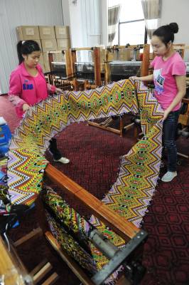 5月27日,胡州(右)和康红菊(左)在编织(展示、卷锦)“土家之花”西兰卡普。