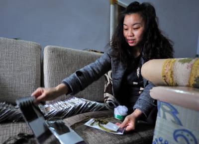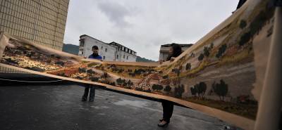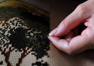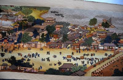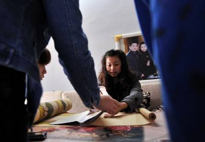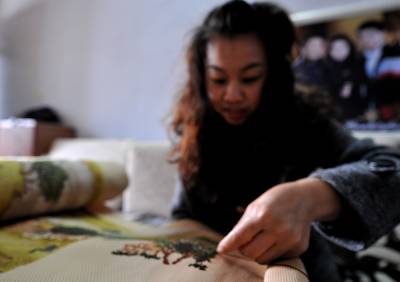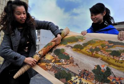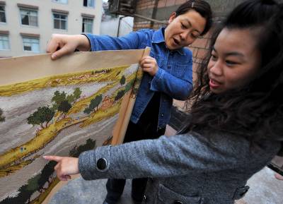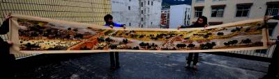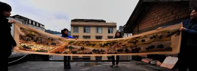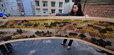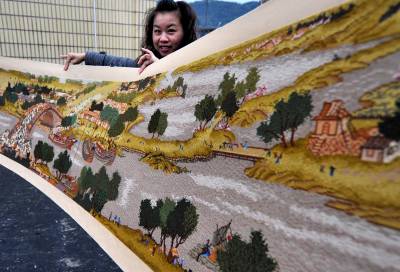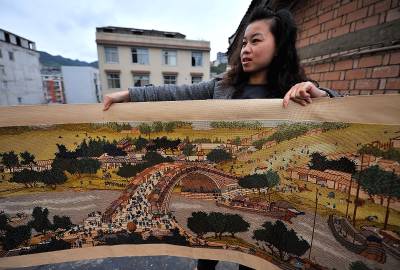 15日,宣恩县珠山镇妇女刘莉向人们展示她绣的《清明上河图》。这幅刺绣图全长6米,宽1.1米。据刘莉介绍,自2008年9月起开工到现在的一年半时间里共绣了约250万针,大约还需10天就可以全部完工。目前刘莉已买好4月28日飞上海的机票,将携带这副《清明上河图》参加世博会。(视界网签约摄影师:宋文摄)