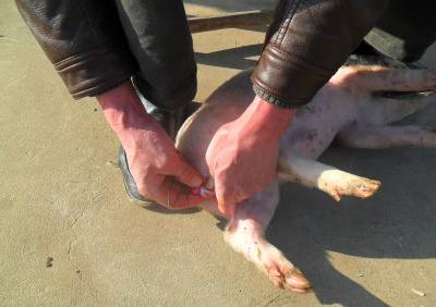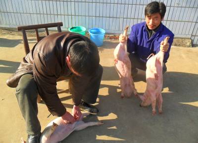 小猪满月后就要劁。劁公猪时,兽医将其踩在脚下,一手握住睾丸,一手用刀划破其外皮,用手挤压出两个睾丸并切除, 刀口不需缝合。劁母猪时,兽医在其腹部开口,将中指或劁猪刀柄伸入腹内,勾出卵巢、输卵管及子宫体并全部切除,刀口也不用缝合。最后是把猪尾巴割掉大半寸,连同切除的睾丸或卵巢、输卵管及子宫体全部甩到猪栏屋顶上,边甩边念:“卵子(花子)甩上屋,猪长三百六”。下面拍摄的是被省农业厅授于“全省先进村级动物防疫员”、宜昌市夷陵区分乡镇棠垭村兽医左万龙劁猪的组图。 (本报视界网 袁国悦摄]
