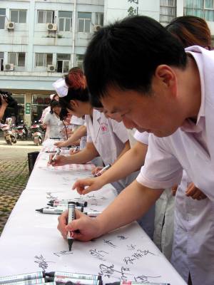 5月26日,黄梅县妇幼保健院医护人员在公开承诺条幅上签名。当日,该县卫计局举行“纠正医药购销和卫生计生服务中不正之风专项治理公开承诺”签名仪式,拉开在全县卫生计生系统深入开展纠正医药购销和卫生计生服务中不正之风专项治理活动序幕,旨在践行党的群众路线宗旨,规范服务行为,严明行业纪律,切实维护广大患者健康权益。(本报视界网 吴志雄 摄)