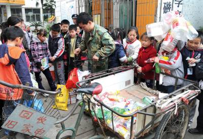 小学生卖破烂献爱心.15日,黄石市磁湖小学学生把用过的旧书、旧课本以及空矿泉水瓶卖给收废品的师傅,将卖废品的钱用来捐助西南干旱地区和刚发生地震的青海玉树地区。当日,该校学生卖废品所得3千多元,准备全部捐给灾区学生,表达他们的一片爱心。黄石市黄石日报摄影部邱孝威摄电话:13807232603邮编:435002