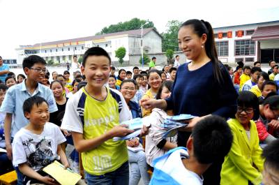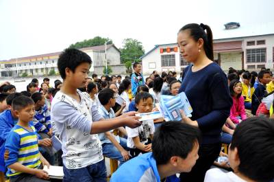 6月3日,在恩施市红土乡民族中学操场上,同学们正在争相抢答环保知识的“战利品”。