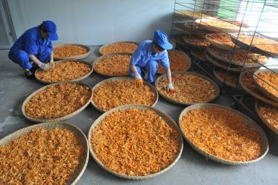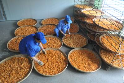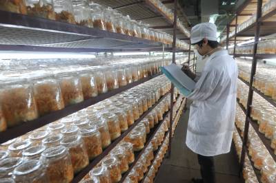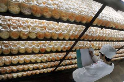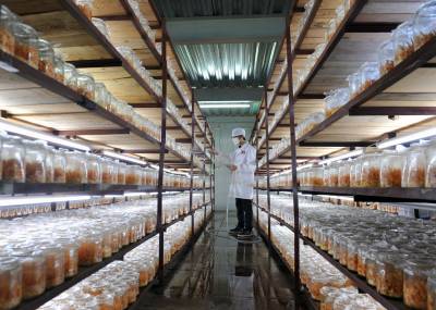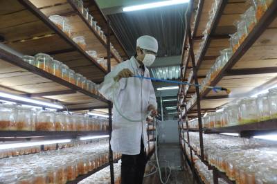 6月4日,在恩施市一国家高新技术企业,工人在为硒虫草喷水。(培植间察看硒虫草生长状况;筛选、风干硒虫草。)