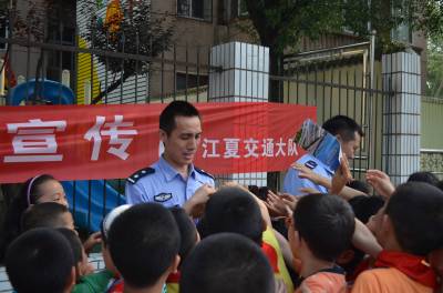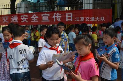 6月4日,武汉市江夏区交通大队的交警走进江夏区实验小学,开展交通安全宣传日活动,向同学们发放交通安全宣传册,宣传交通安全知识。(视界网 张超)