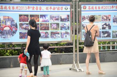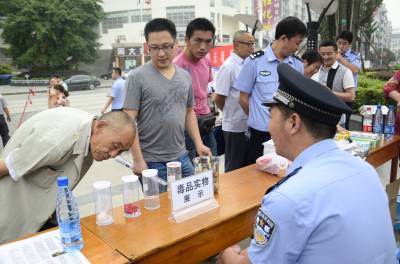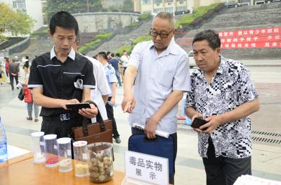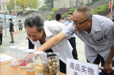 6月4日,巴东县城巫峡广场上,居民正在参观毒品实物。当天,恩施州禁毒宣传城际接力活动在此拉开序幕。 “6·26”国际禁毒日到来前,为进一步强化禁毒宣传,州公安局禁毒支队决定采取八县(市)交换宣传、接力宣传的形式,以“青少年拒绝合成毒品”为主题,送禁毒知识进社区、进学校、进乡村。(视界网 谭平 谭凌云 摄)