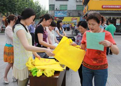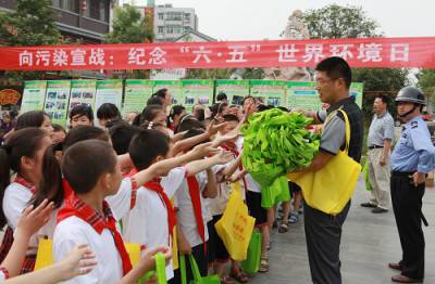 6月5日,钟祥市在郢中护城河明清街广场设立环境保护宣传咨询服务台,摆放环保宣传展板,向过往群众赠送环保袋和散发宣传资料等形式,纪念“六五”世界环境日。这是参加宣传活动的学生们踊跃领环保袋和宣传单准备到街头散发时的情景和工作人员向市民散发环保袋和宣传单的镜头。本报视界网 赵云福 摄