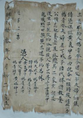 4月14日,恩施州博物馆收到一份由退休医生杨荣早夫妇无偿捐赠的清末”过子约”。该”过子约”写在一张黄色的薄纸上,长约29厘米,宽约22厘米,内容为杨青发将其族侄杨一寿过继为自己名下儿子的契约凭证,落款时间为”光绪二十三年八月初二”(距今113年)。过子约中的”族侄杨一寿”即无偿捐赠者杨荣早的祖父。通讯员周光兵、龚艳萍摄恩施日报社记者部周光兵13277584567