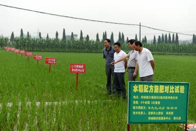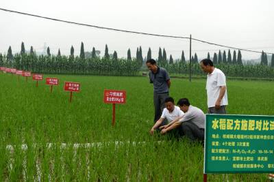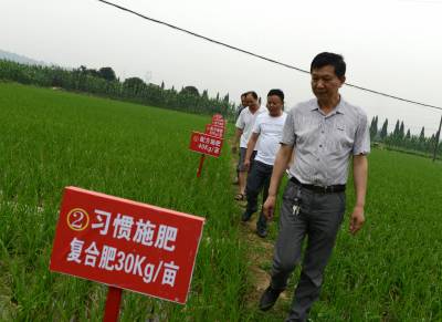 为农民测土配方施肥 6月7日,农技人员在查看秧苗生长情况。为了给农民施肥提供科学依据,宜都市土肥站、宜都市枝城镇农技站在枝城镇选择有代表性的秧苗地进行各种施肥试验,试验数据出来后供农民施肥参考。