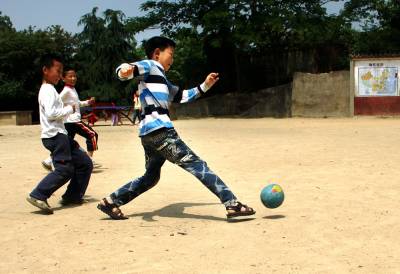 随后,大伙儿翻箱倒柜,找出一个皮球,摆上几个纸盒子,用竹棍在地上画出几条线,就成了足球场。就这样,在不免杂乱的吆喝声中,大别山下第一场足球赛开场了。对孩子们来说,这是他们人生中第一次接触足球,虽然,他们踢的只是个皮球。