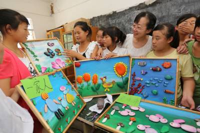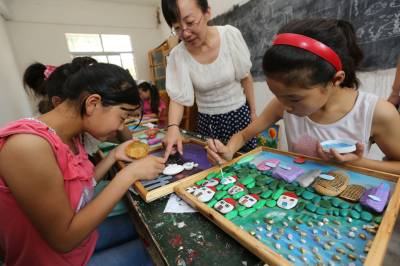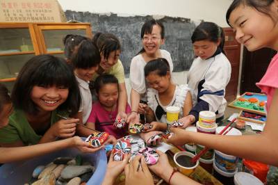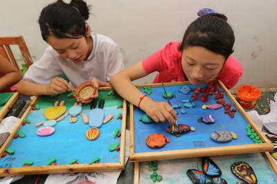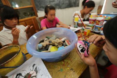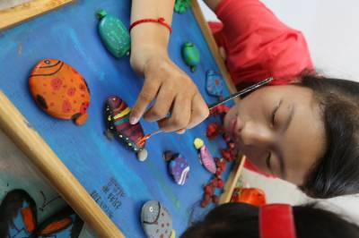 当日,在地处汉江边的小樊中心小学石头画社团,进驻该校的晨光小学启明星团队老师在辅导孩子们绘制石头画。2013年9月,襄阳市晨光小学作为启明星计划项目学校,派出副校长和两名骨干教师组成启明星团队,赴农村小学——樊城区小樊中心小学“支教”。教学生做太阳花,用鸡毛做贴画,用废报纸和棉花做“空中花园”……在进驻该校启明星团队老师的带领下,小樊中心小学先后成立了19个学生社团。小樊中心小学位汉江边上,看见取之不尽的小卵石,来自城里的教师突发奇想的决定用石头来作为绘画材料,带着学生捡石头、画石头画,各种各样卵石为师生们提供更广阔的创作空间。