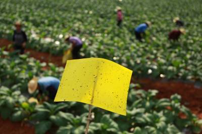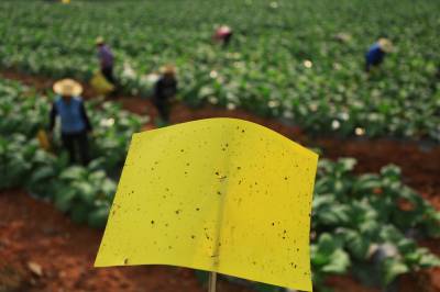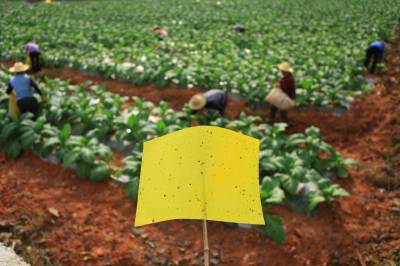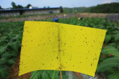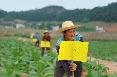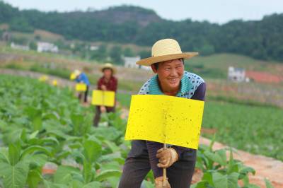 治虫流行“小黄板” 6月11日,竹山县擂鼓镇金岭村农民在烟地里放置防虫板治虫。连日来,随着气温攀升,害虫明显增多。为有效防止害虫对农作物的危害,尽量不使用或少用农药,竹山县大力推广使用黄色粘虫板(黄色信息素诱虫板),并配合太阳能杀虫灯等生物和物理防虫措施,减少虫害。据了解,小黄板在野外自然条件下使用粘性油可保持三个月左右,当虫粘满板时,及时重涂粘油,可重复使用。(视界网 章磊 摄)