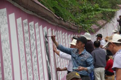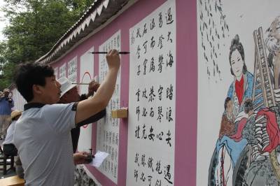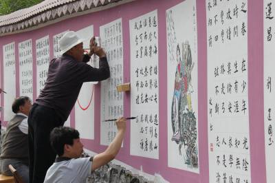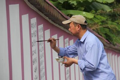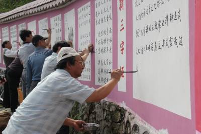 6月11日,书法美术大师们正在鹤峰县中营镇龙家湾村的百米文化墙上进行现场创作。 据悉,近年来,鹤峰县在下大力促进农业增效、农民增收的基础上,注重加强村级精神文明建设,结合在全县开展的全民素质提升工程,因地制宜,利用农民文化广场和文化墙(长廊)等设施,并邀请专业团体,定期进行文艺巡演、送科技下乡、书画笔会等活动,积极传播正能量,极大地丰富百姓业余文化生活,提升了村民素质和村庄品位。(通讯员周锐)