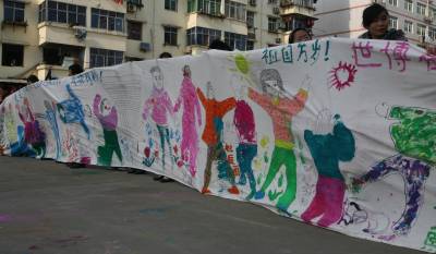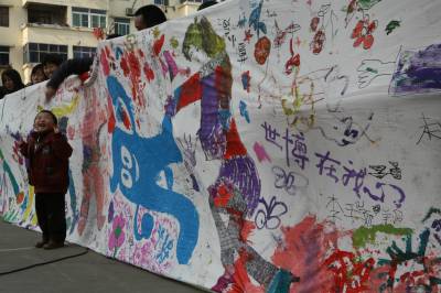 4月15日下午,湖北省襄樊地矿金星幼儿园,百余名孩子和家长共同完成一幅长卷作品。让孩子躺在白布上,摆出各种运动姿势,父母用笔勾勒线条,然后,父母和孩子一起将之填色。该长卷宽1.6米,长41米,寓意第41届世博会。
