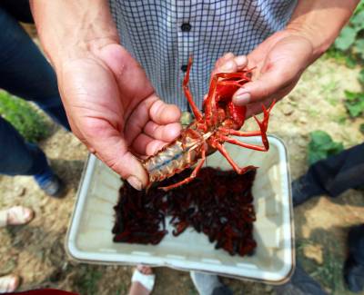 6月11日,汉川马口镇同丰水产专业合作社养虾大户方谊红交替挥洒喂养龙虾的黄豆和经处理的粹鱼(图一)。龙虾一般在污泥中生长,但方谊红摸索出一套清水净池养龙虾,黄豆、碎鱼、小米草作食饵的生态健康养虾经,养出的龙虾肉嫩、个大、干净闻名市场,不仅俏销武汉、潜江等地,还被经销商出口国外。方谊红骄傲地展示刚刚网起的小龙虾清洁如洗(图二)。
