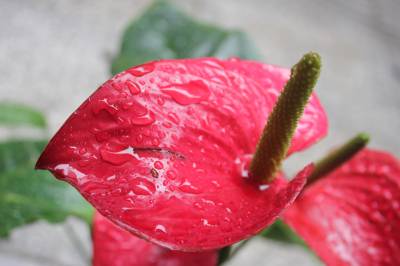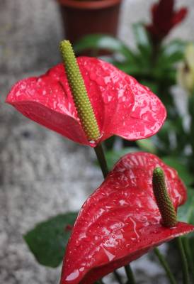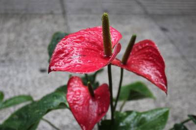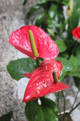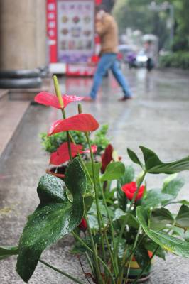 6月14日,十堰市迎来入夏最明显降雨,气温也随之至少下降了10℃,感觉非常舒适。十堰市城区街头,一商家将自己种植的鸿运当头、红掌等花儿,摆在雨中,接受甘露的滋润,让花儿更加美丽妖娆。(视界网 章新俊 摄)