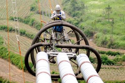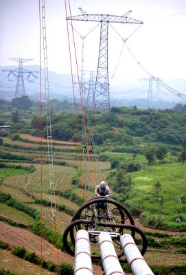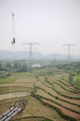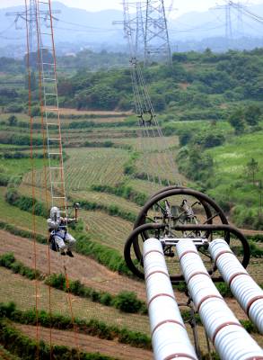6月14日,在湖北省武穴地区±800千伏特高压直流锦苏线2963号耐张塔上,湖北省送变电工程公司带电作业队在34摄氏度高温中带电消缺。湖北电力公司在迎峰度夏前,积极落实国家电网公司要求全面开展输电线路隐患排障工作,及时发现并及时处理缺陷,当日,经过湖北省送变电工程公司带电队2个小时高空作业,全国特高压直流输电线路采取自由软梯法在耐张塔上,首次由地电位进入等电位,带电消除间隔棒支撑脱落隐患,确保迎峰度夏期间特高压直流电位安全稳定运行。