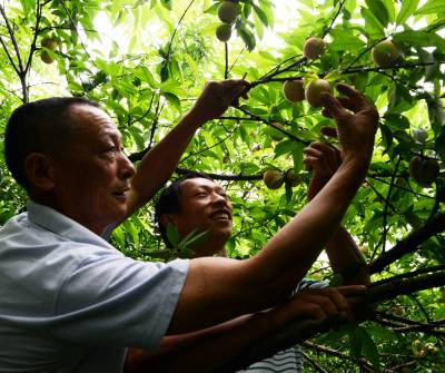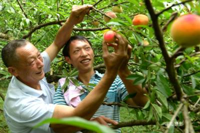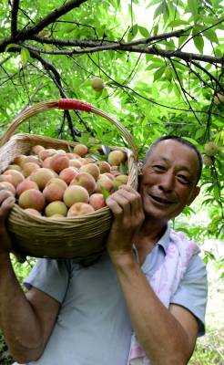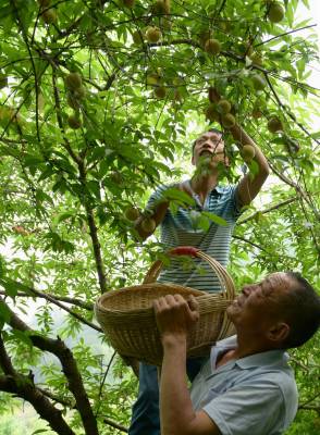 “宜都脆桃”新鲜上市 6月14日,宜都市枝城镇架锅山村四组别之文(左)在采摘桃子。架锅山村有桃园500多亩,年产桃子70多万公斤,创收200多万元。其“宜都脆桃”因汁多味美、色泽艳丽、营养丰富而广受消费欢迎。