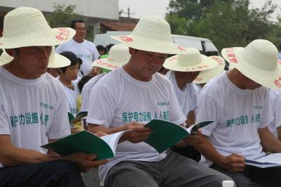 6月15日,在±800千伏复奉、锦苏特高压线路周边的咸宁市马桥镇高赛小学操场上,湖北省送变电工程公司通过开展电力设施保护宣教活动,对年前输电线路防山火工作中表现优秀突出的群众护线员进行了表彰奖励,与广大输电线路沿线群众面对面进行宣传,重点讲述和宣传电力保护常识,引导群众自觉加入保护电力设施的行列中,做一名保护电力设施的卫士,通过群众将电力设施保护知识传播给邻里乡间,努力营造“人人爱护电力设施”的良好氛围.