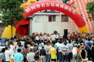 6月16日,郧县郧阳奇石古玩城开业揭牌。郧阳奇石古玩城一期工程占地2000平方米,进驻30多家奇石,绿松石,古玩,古装家俱店,展出奇石10000多枚(件),古董500多件,此次投资建设200万元,可拉动旅游收入2000万元,二期,三期将在以后陆续开工,届时展厅面积达10000平方米,拉拉动旅游收入产业近亿元,解决就业500多人。