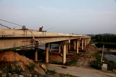 从鄂西北前往襄(阳)荆(州)横跨汉江最大支流南河的谷城县南河公路大桥,自1977年12月施工至1980年元旦建成通车后,34年来再无新桥建设。随着经济和社会的发展,旧桥因老、窄、车流量大而不堪重负。2012年10月28日,谷城县总投资9125万元开工建设一座桥长786米、桥宽27.5米的南河三桥,将于6月底正式通车。此桥作为303省道“襄(阳)谷(城)线”控制性工程投入使用后,对促进鄂西北地区交通畅达和经济社会快速发展将起到重大作用。图为建桥工人正在紧张安装桥栏。