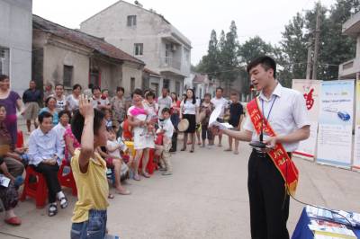 汉川市农村信用社开展“金融知识万里行”活动,走进300个自然村,发放宣传资料9万余份,把金融知识送到农户的家门口。利用播放宣传片、金融知识有奖问答等农民喜闻乐见的形式,向农户宣传金融风险防范及电子银行产品知识。图为6月17日信用社员工在里潭乡光一村电影放映前进行金融知识有奖问答。 摄影:鲁世雄
