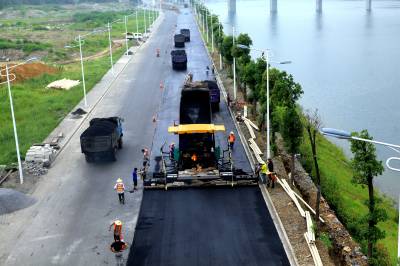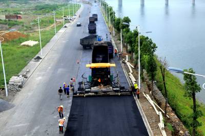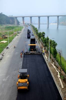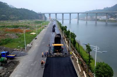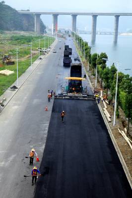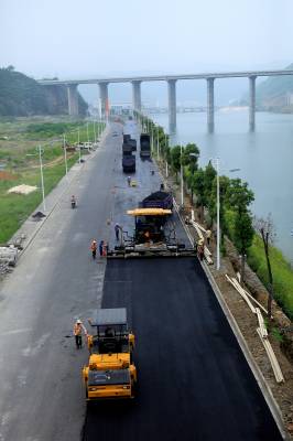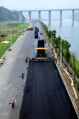 竹山县潘口一级公路开始面层刷黑 6月19日,工人在346国道竹山县潘口乡小漩村一级公路上铺筑沥青。当日,全长15公里的潘口一级公路开始铺筑沥青面层,工程将于本月底完工。(视界网 章磊 摄)