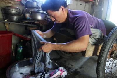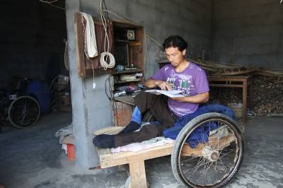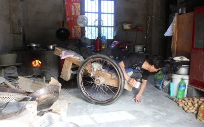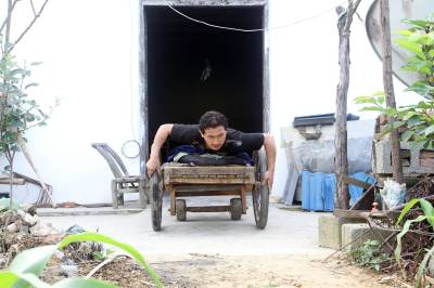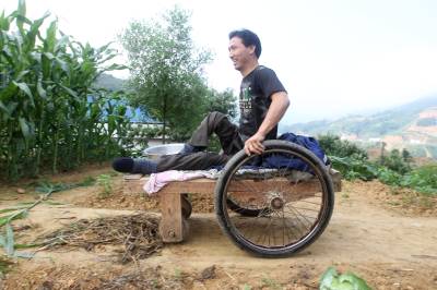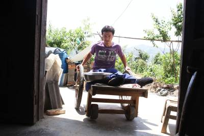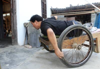 去年,县残联捐赠给他一辆轮椅,他一直舍不得用,只是闲时坐在上面逛逛公路玩玩儿,在家及劳作时还是坐在自制的板车,因为坐板车上能爬,能劳动。