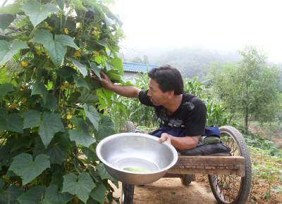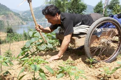 6月18日,竹溪县新洲乡新华村二组下肢高位瘫痪的农民贺荣林坐板车轮椅去菜地。