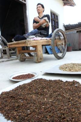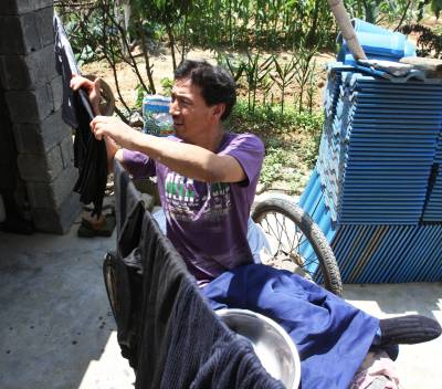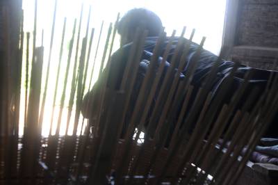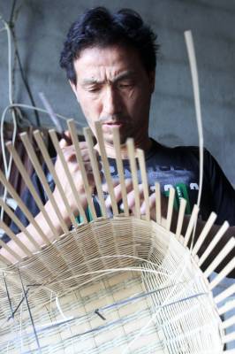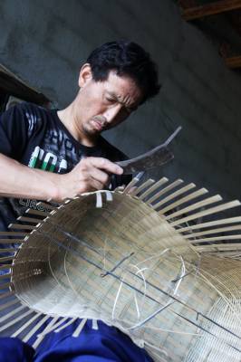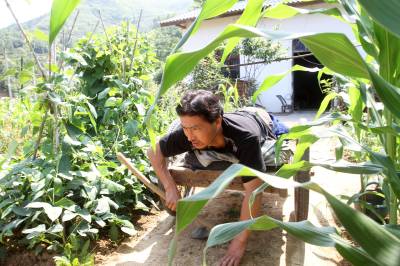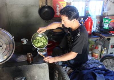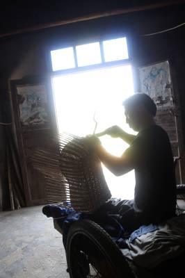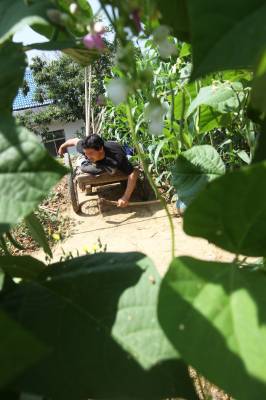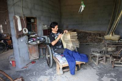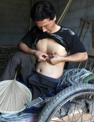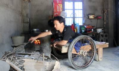 瘫痪后无法行走,他自画图纸,请父亲制作轮椅,改造板车充当“腿脚”,从此开始了他的“板车上的生活”。种菜、洗衣、做饭,这些平常的生活,对于贺荣林来说都很困难,都在板车上完成。他生活主要靠低保和替人加工点竹器的手工费,贺荣林说现在的政策真是太好了,低保每月也涨到170元,去年还多了一笔收入是政府租他的一亩多地一年800元的土地租金,菜自己种,编些竹篮、竹筐挣点加工费,一个人生活足够用了。