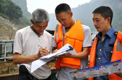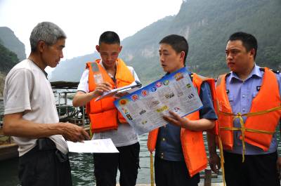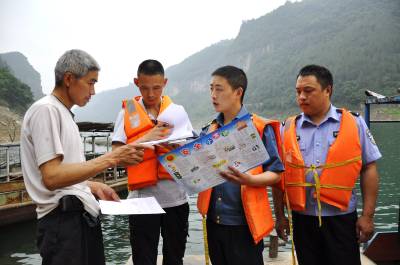 汛期紧绷安全弦 6月19日,恩施市红土乡安监办的工作人员正在对自用船舶主进行安全知识宣传教育。 入汛以来,该乡强化水上交通船舶安全作业,组织公路、安办、派出所等单位对库区渡口的农用船舶进行安全检查,重点就渡船是否超载、乘客是否佩戴救身衣、自用船只是否存在非法载人等进行检查,并加强对驾乘人员的安全教育,形成水上安全高压态势,有效预防水上交通安全事故的发生。(视界网彭绍峰吕玉梅摄)