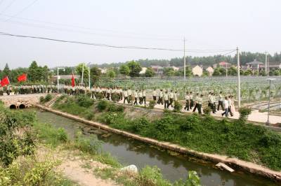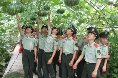 6月20日,鄂州市武警支队组织官兵来到燕矶镇池湖社区参观新农村建设,让官兵们感受驻地新农村建设的发展变化。图为官兵们参观社区农业大棚。