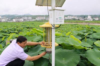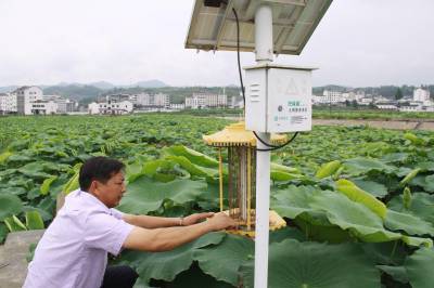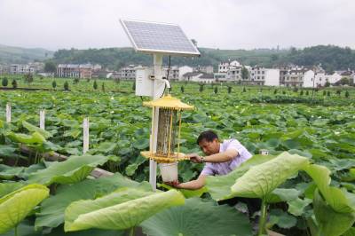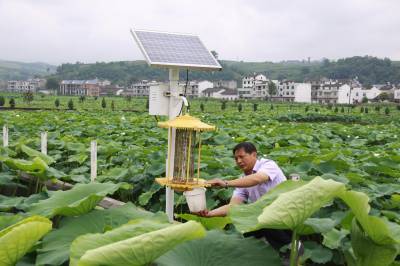 绿色防虫进农家 (图文) 竹山县宝丰镇中心学校 朱本双 电话:13177481456 邮编 :442213 电子信箱:zsbfzbs@126.com 身份证号码:422624196910182052 6月21日,竹山县麻家渡镇柿树坪村农民袁涛正在荷塘里察看太阳能灭虫灯的杀虫情况。盛夏时节,正值病虫害高发期,该县在莲藕基地、茶园、稻田、烟叶等地,应用太阳能灭蚊灯、环保粘蚊纸等生物与物理措施防治害虫,减少对农药的喷施,极大地推动了生态环保农业的发展。